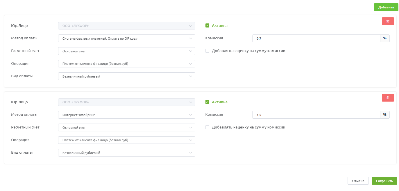 Добавьте методы оплаты кнопкой "Добавить" Интернет-эквайринг и СБП. Заполните все необходимые поля.